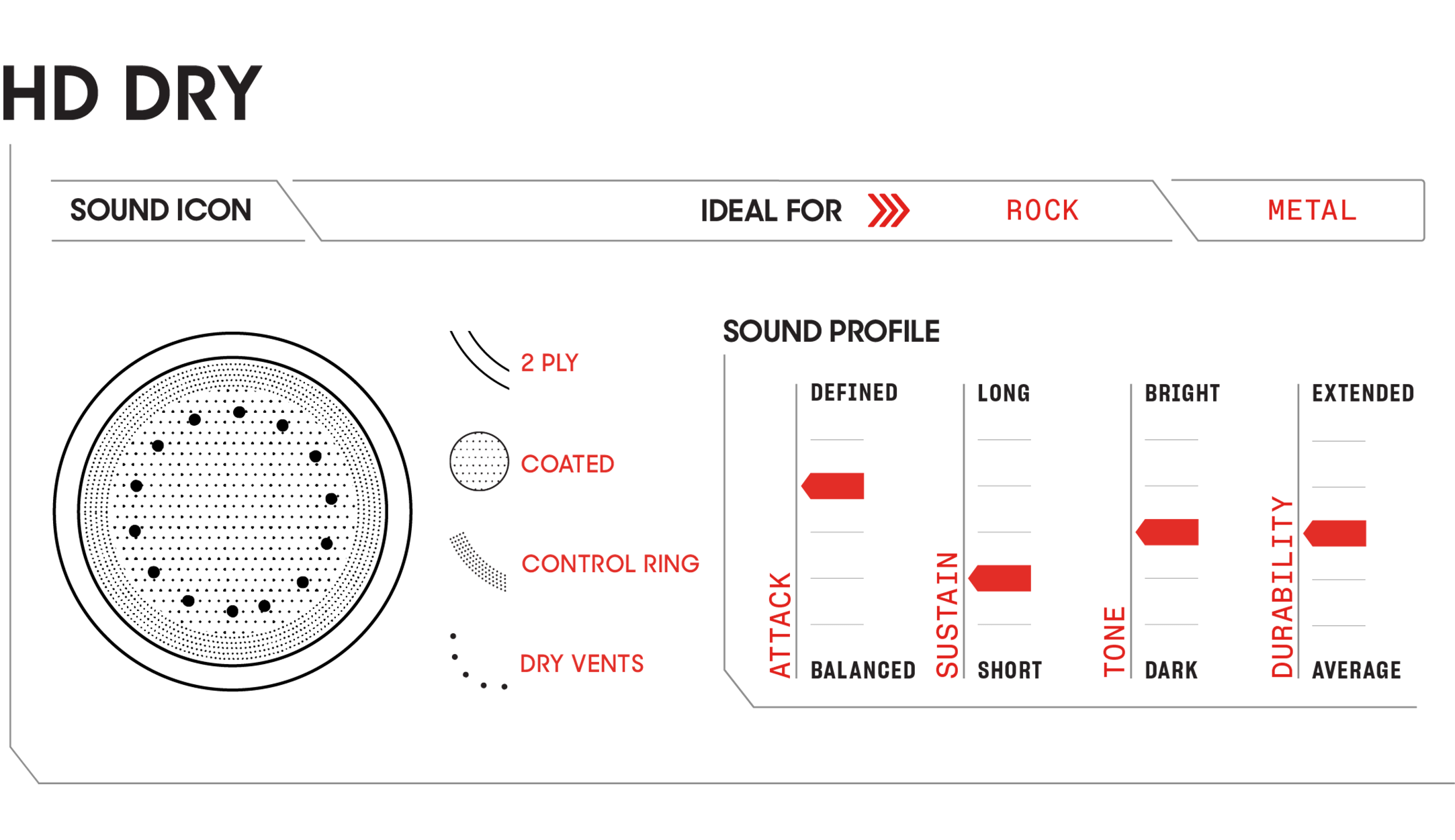 14-inch HD Dry coated two-ply snare batter head with a 2mil overtone control ring and dry vents for a focused, articulate response.