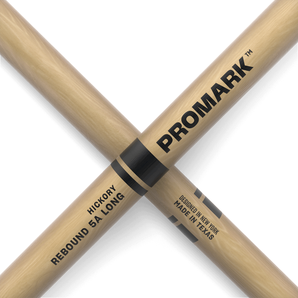 Long 5A hickory sticks with rear-weighted rebound and an acorn tip for extra reach and quick, controlled response.