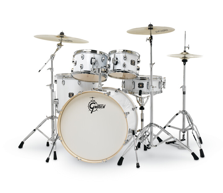 Start your drumming journey with "That Great Gretsch Sound" in a complete, ready-to-play package for aspiring drummers, presented in a classic White finish.