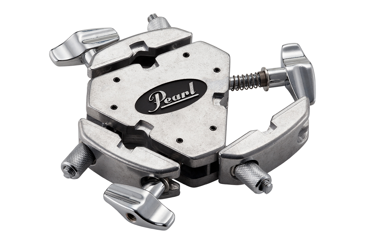 Versatile three-way adapter clamp from Pearl for connecting multiple drum hardware components at various angles.