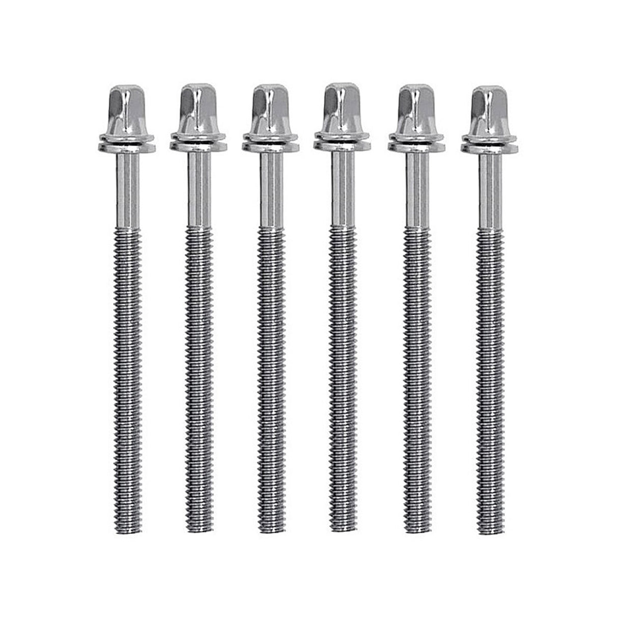 Collection of six 57mm tension rods with washers for securing and tuning drumheads on various drum sizes.