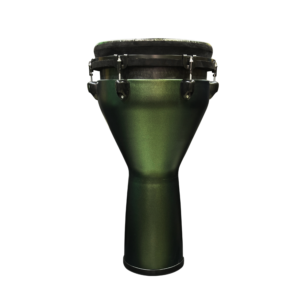 12-inch djembe with a green painted finish and protective cover, delivering traditional hand percussion sounds with a vibrant look.